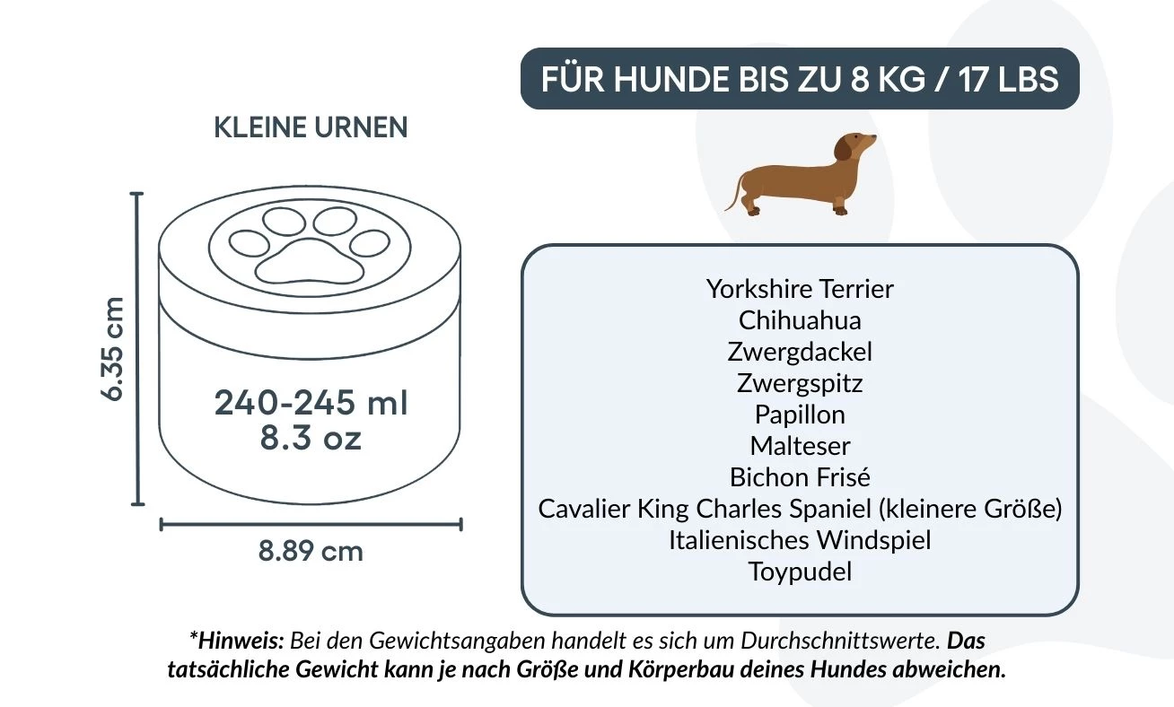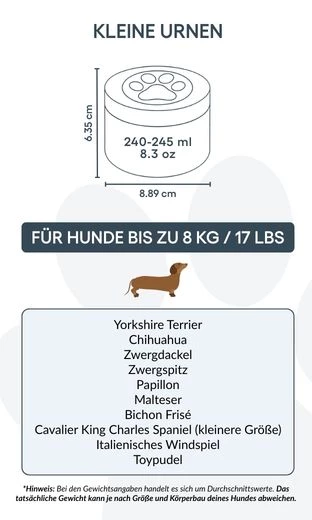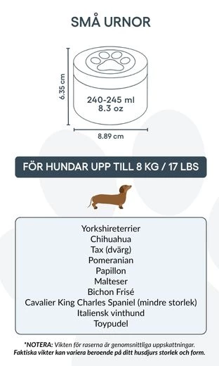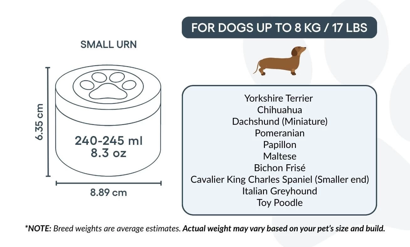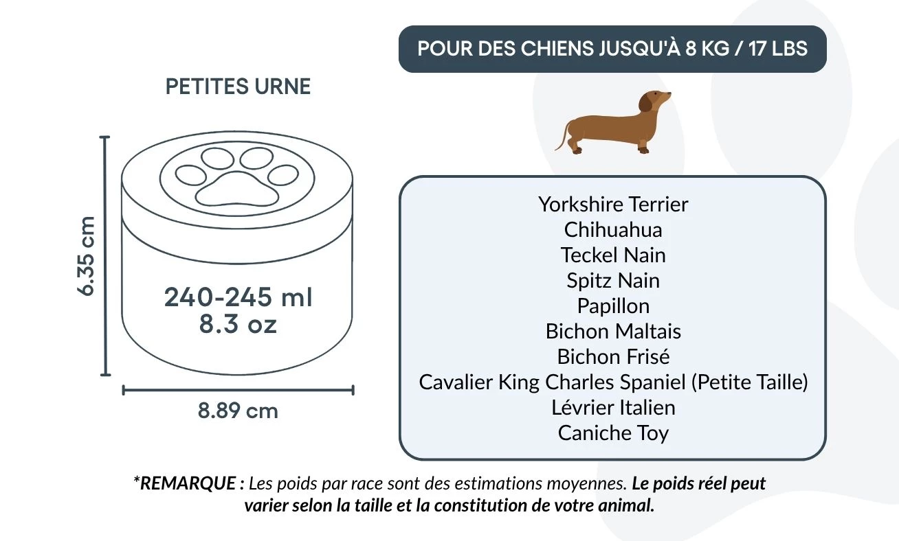 Dimensions / Capacité de l’urne : 8,89 cm (L) × 6,35 cm (H) × 8,89 cm (P) | 240–245 ml / 8,3 oz Convient pour les chiens jusqu’à 8 kg / 17 lbs Races courantes : Yorkshire Terrier, Pékinois, Teckel nain, Caniche Toy