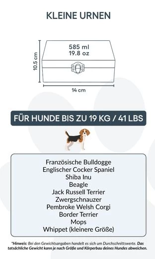 Convient pour les chiens jusqu’à 19 kg / 41 lb, ou pour une partie des cendres d’un chien plus grand.