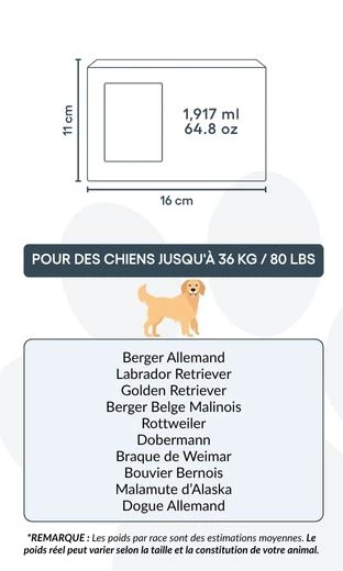 Races généralement compatibles : Labrador Retriever, Golden Retriever, Berger Allemand, Boxer, Husky, Border Collie
