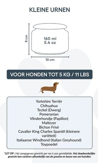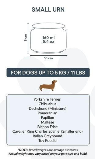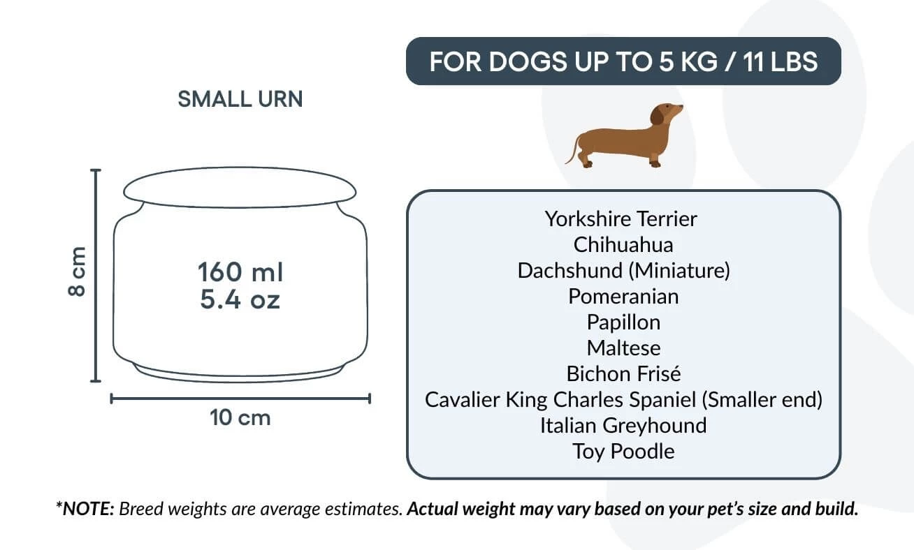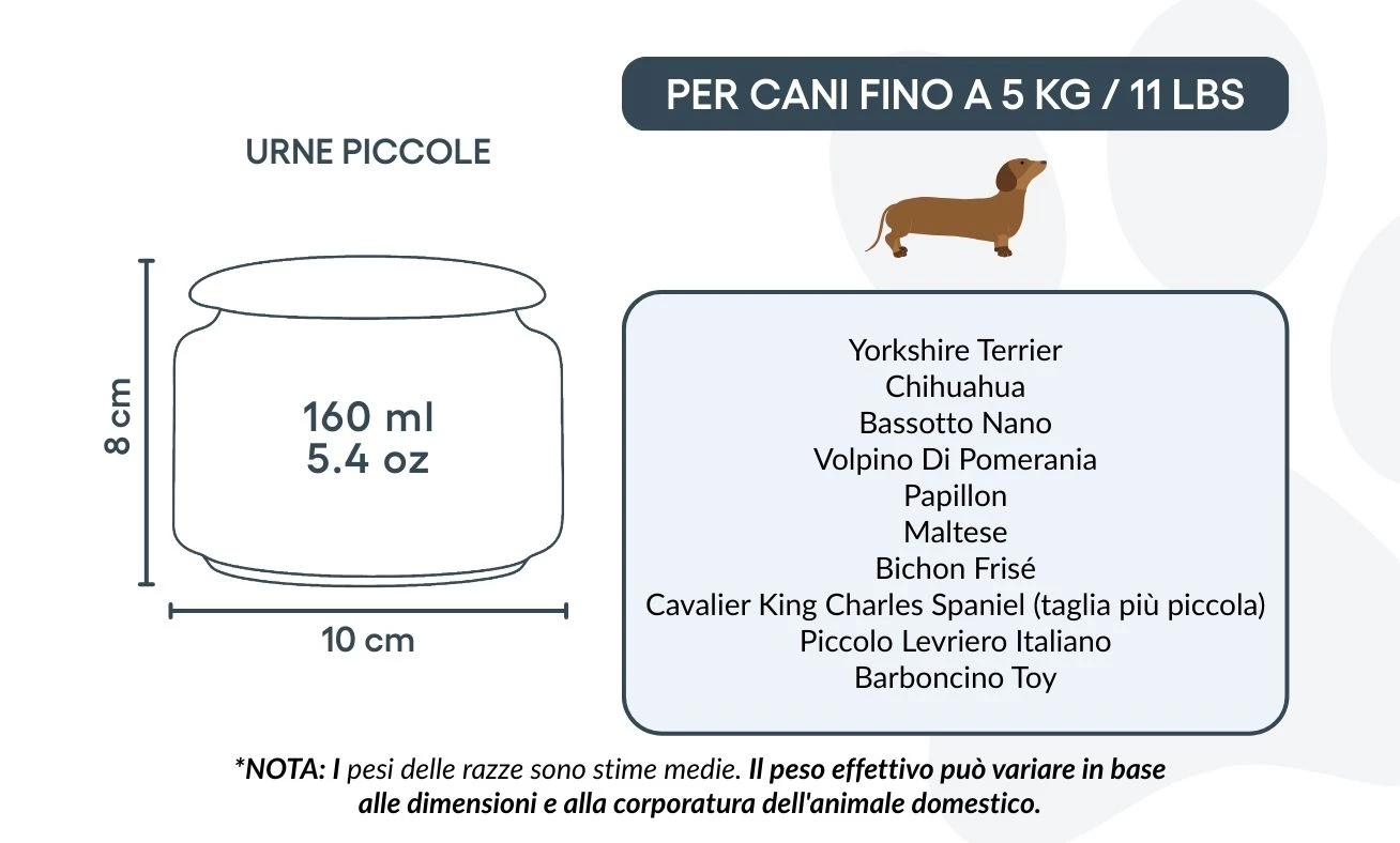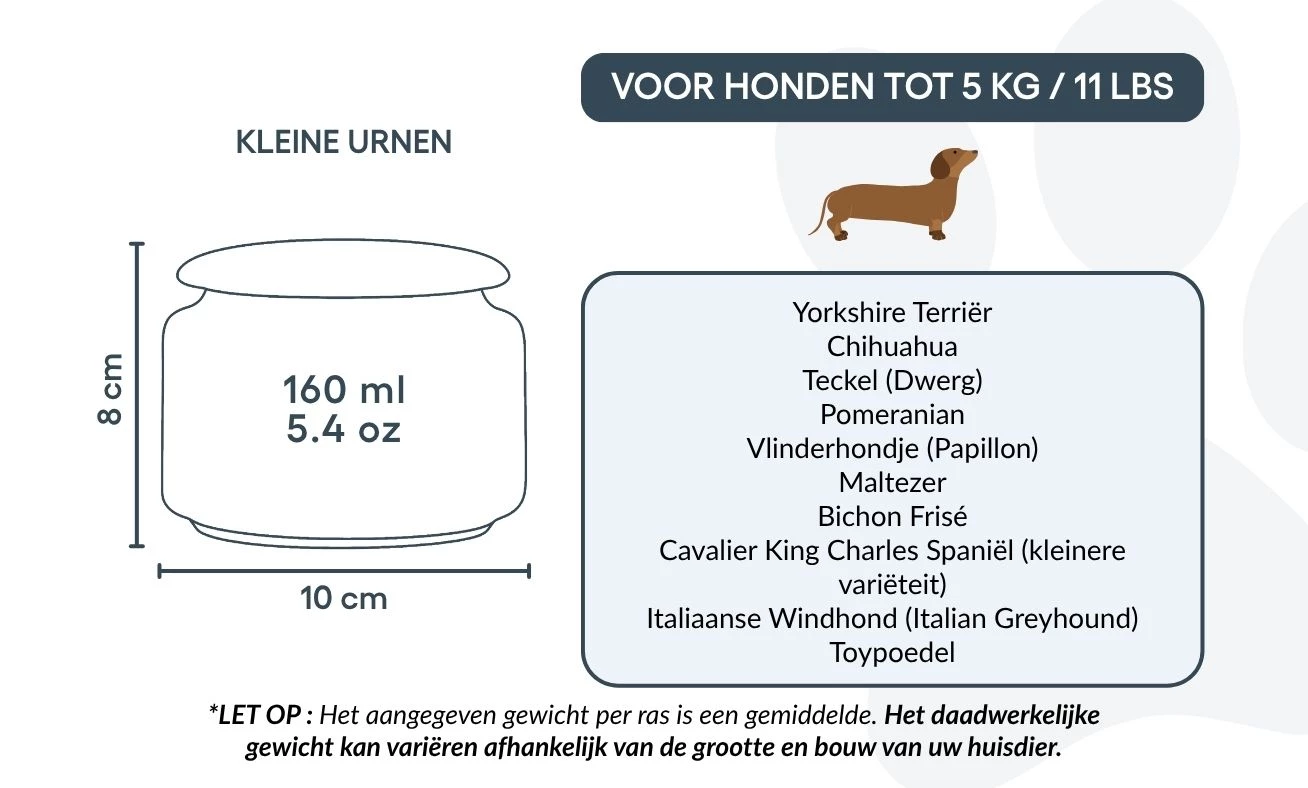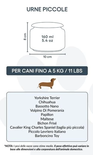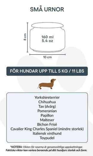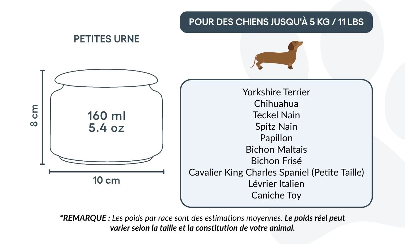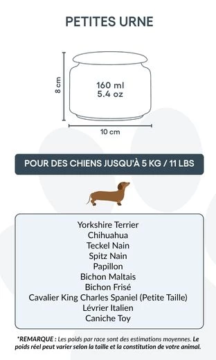 Taille / Capacité de l’urne : 10 cm (L) × 8 cm (H) × 10 cm (P) | 160 ml Pour chiens jusqu’à 5 kg Exemples de races : Caniche Toy, Yorkshire Terrier, Bichon Maltais, Papillon