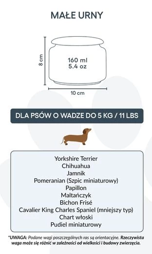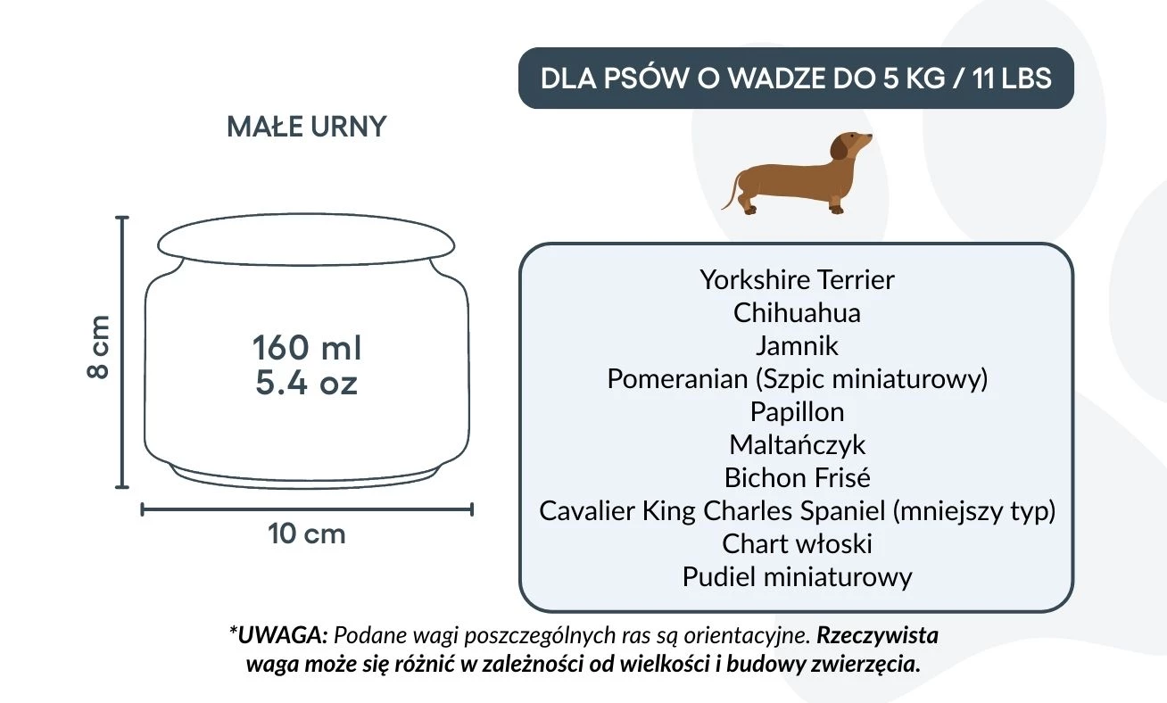 Destinée aux petits chiens jusqu’à 5 kg, cette urne représente un hommage plein de douceur et de respect. Grâce à sa forme épurée et son illustration délicate, elle inspire paix et réconfort dans les moments de souvenir. Elle peut également convenir à ceux qui souhaitent conserver une partie des cendres d’un chien plus grand – pour les partager entre proches ou créer plusieurs souvenirs personnalisés.