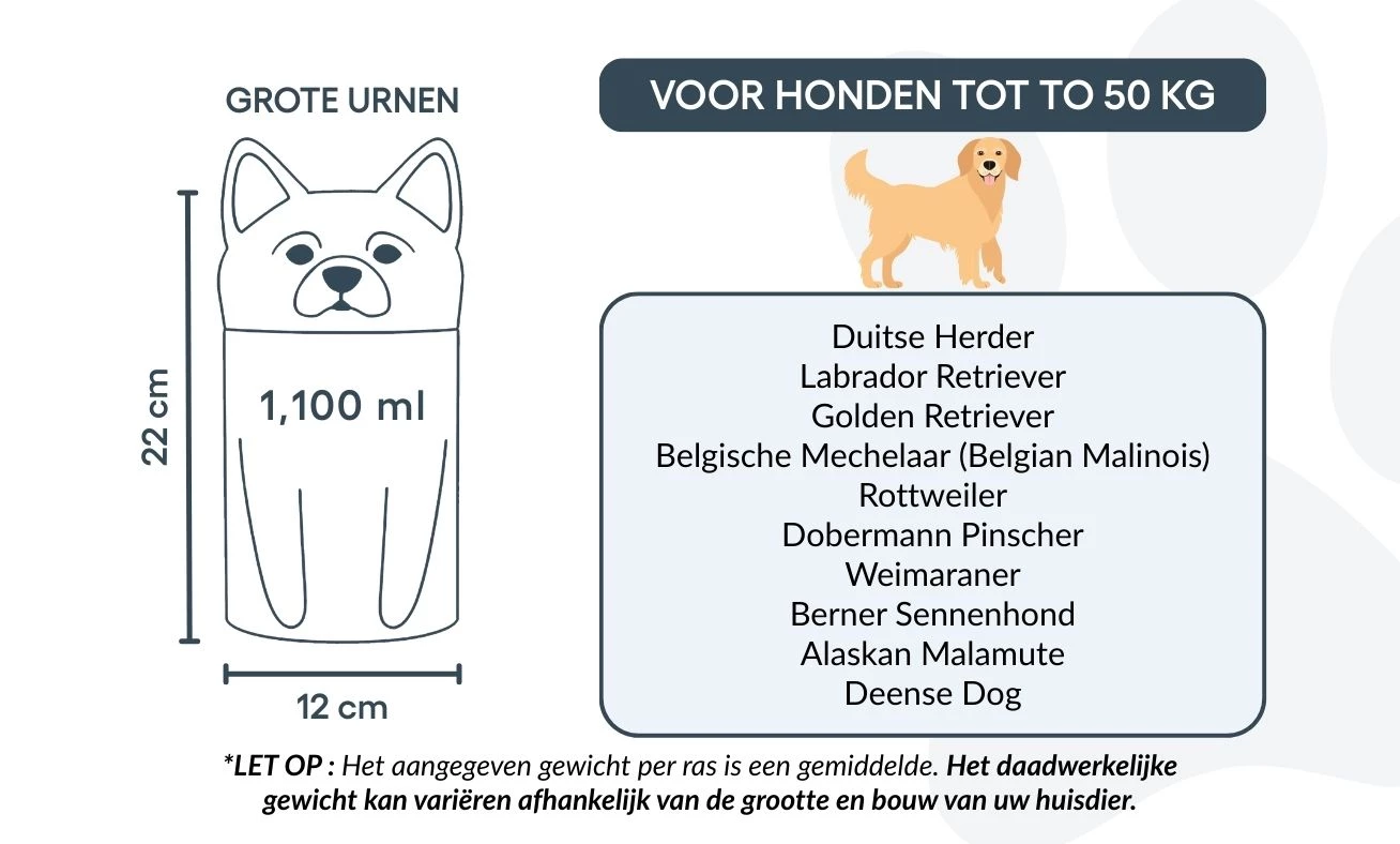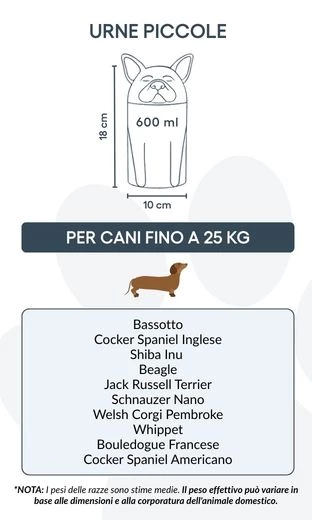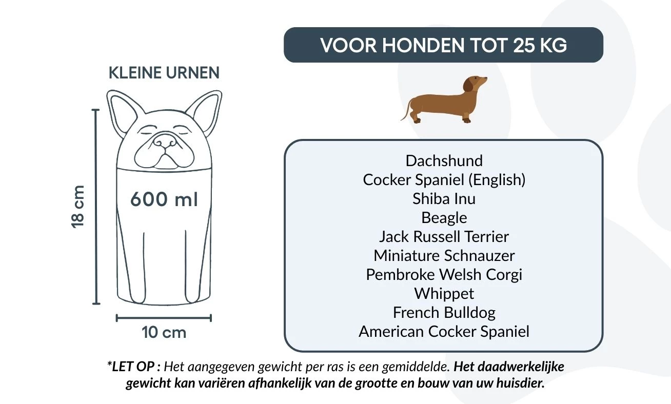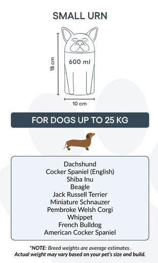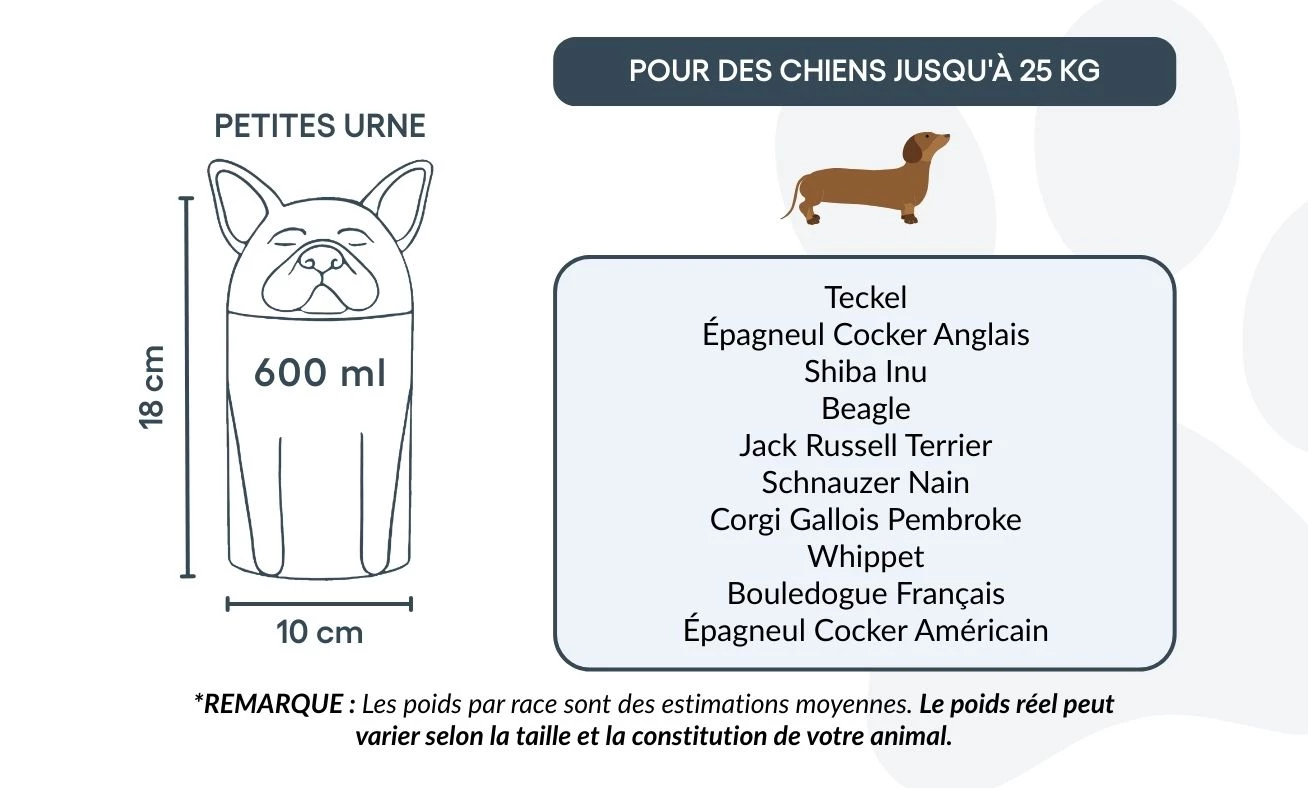 Remarque : les volumes indiqués sont basés sur des estimations moyennes de crémation. Pensez au poids et à la morphologie de votre animal avant de choisir la taille.