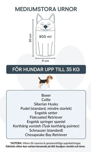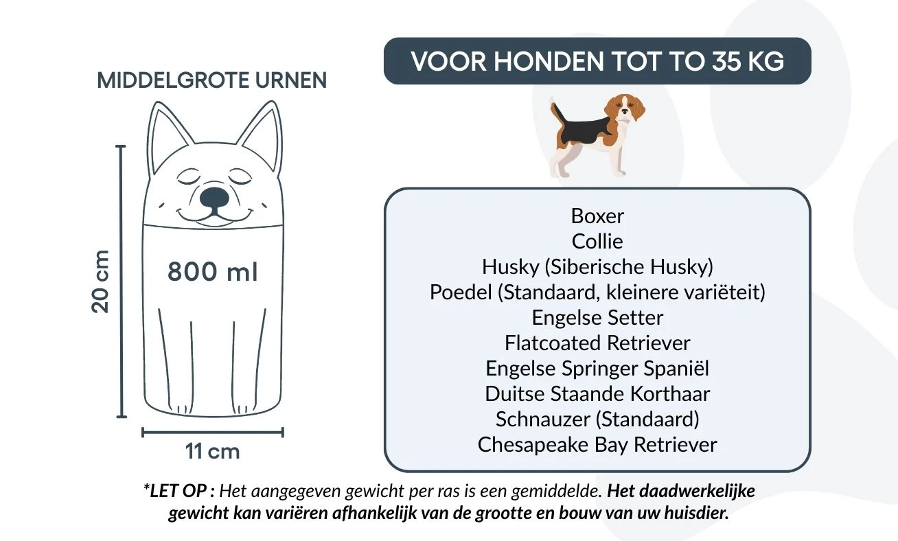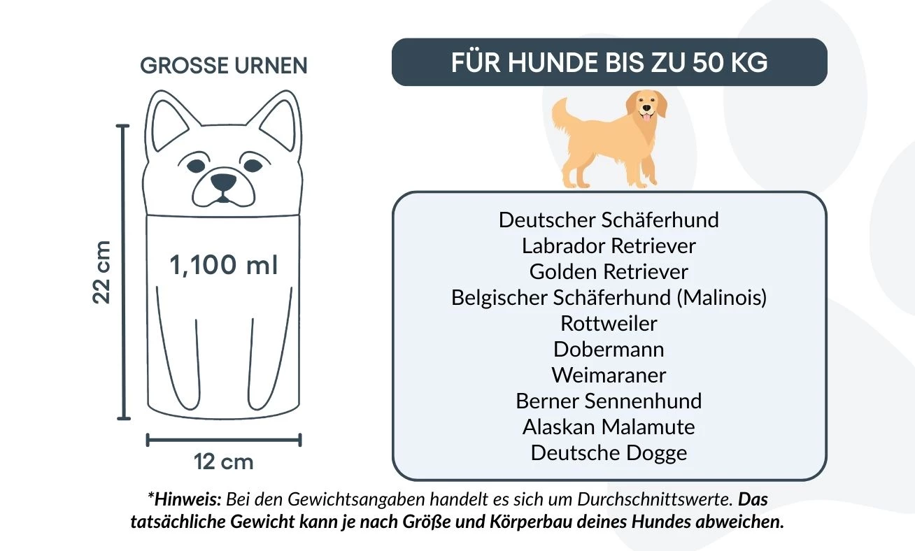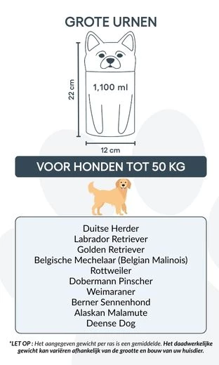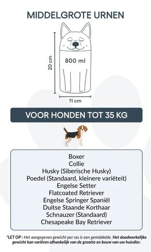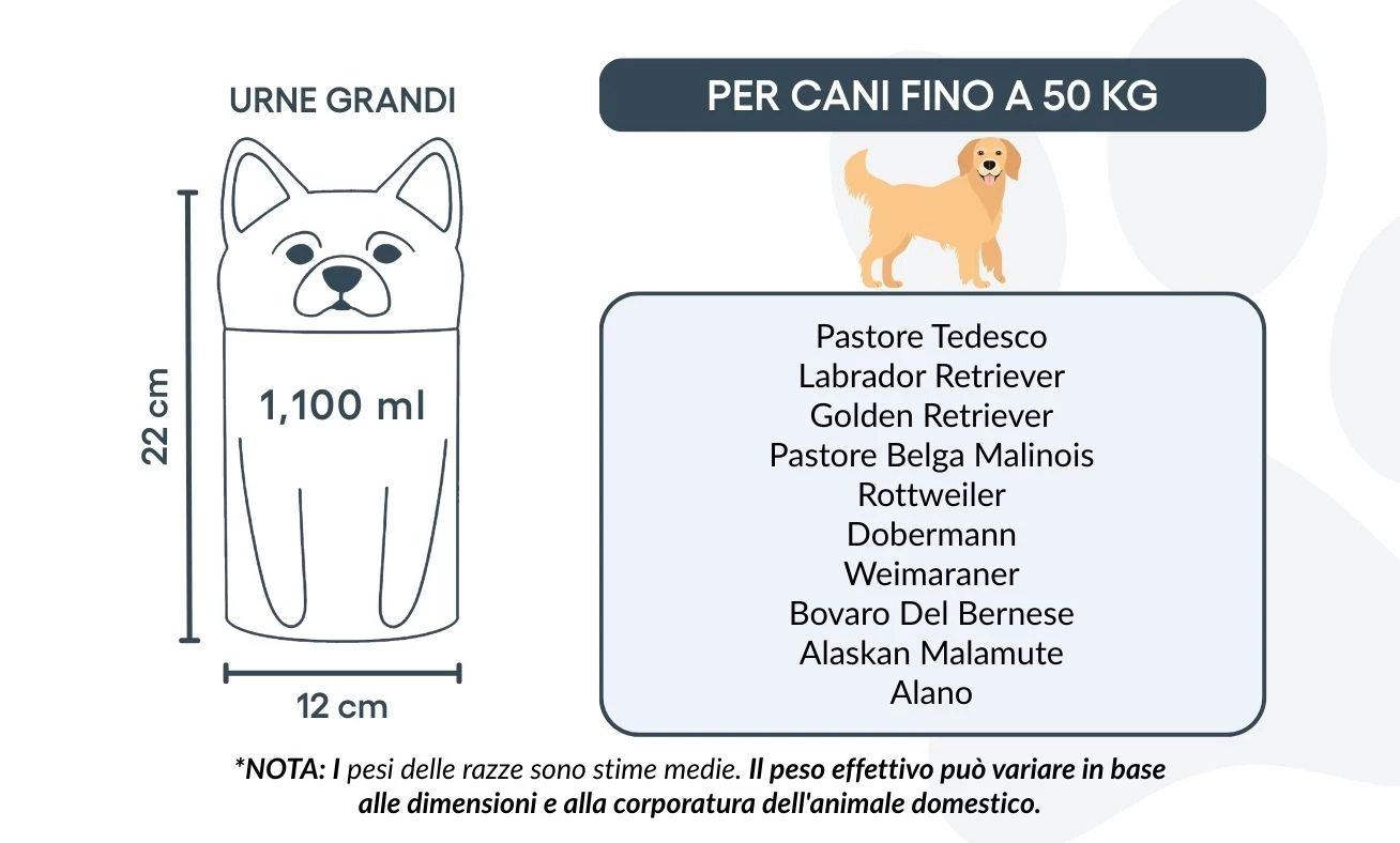 Remarque : les volumes indiqués sont basés sur des estimations moyennes de crémation. Pensez au poids et à la morphologie de votre animal avant de choisir la taille.