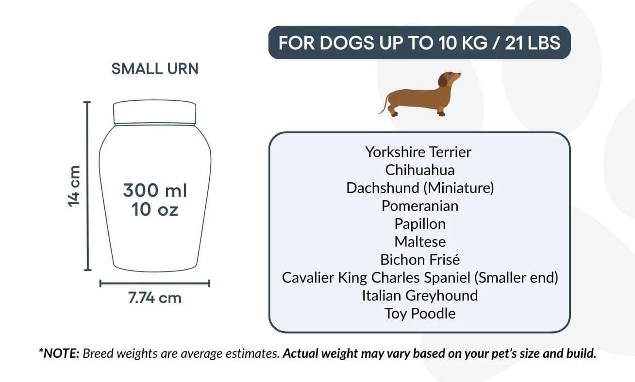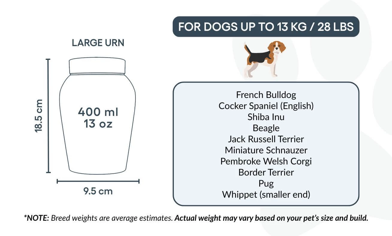 Grâce à son couvercle hermétique et son design personnalisé, cette urne protège les cendres tout en symbolisant l’amour et la fidélité que vous avez partagés. Qu’elle soit exposée sur une étagère, une table commémorative ou dans un lieu de recueillement, elle rappelle avec douceur la présence de votre chien au cœur de votre vie.