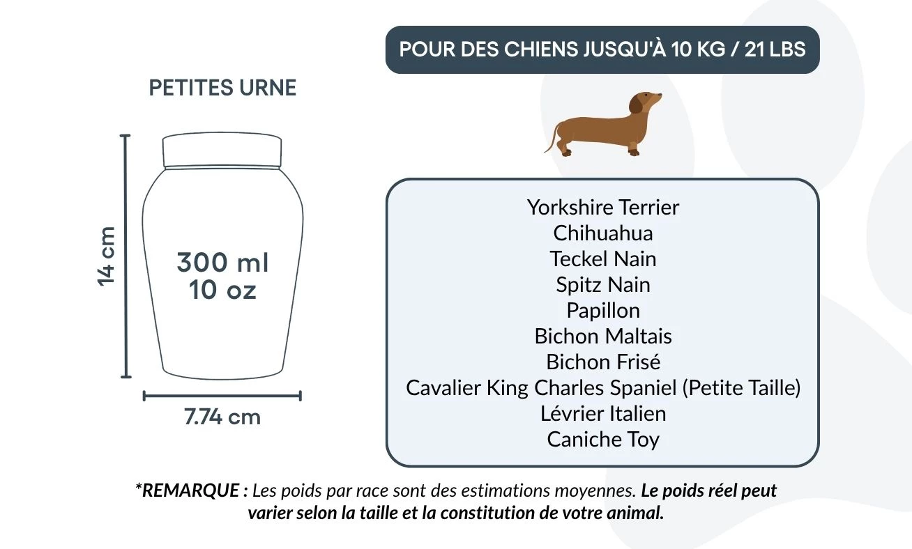 Disponible en deux tailles, elle convient aussi bien pour les petits chiens que pour les chiens de taille moyenne, offrant un hommage sincère et durable à votre animal bien-aimé.
