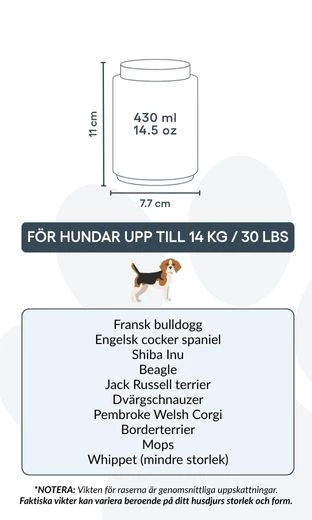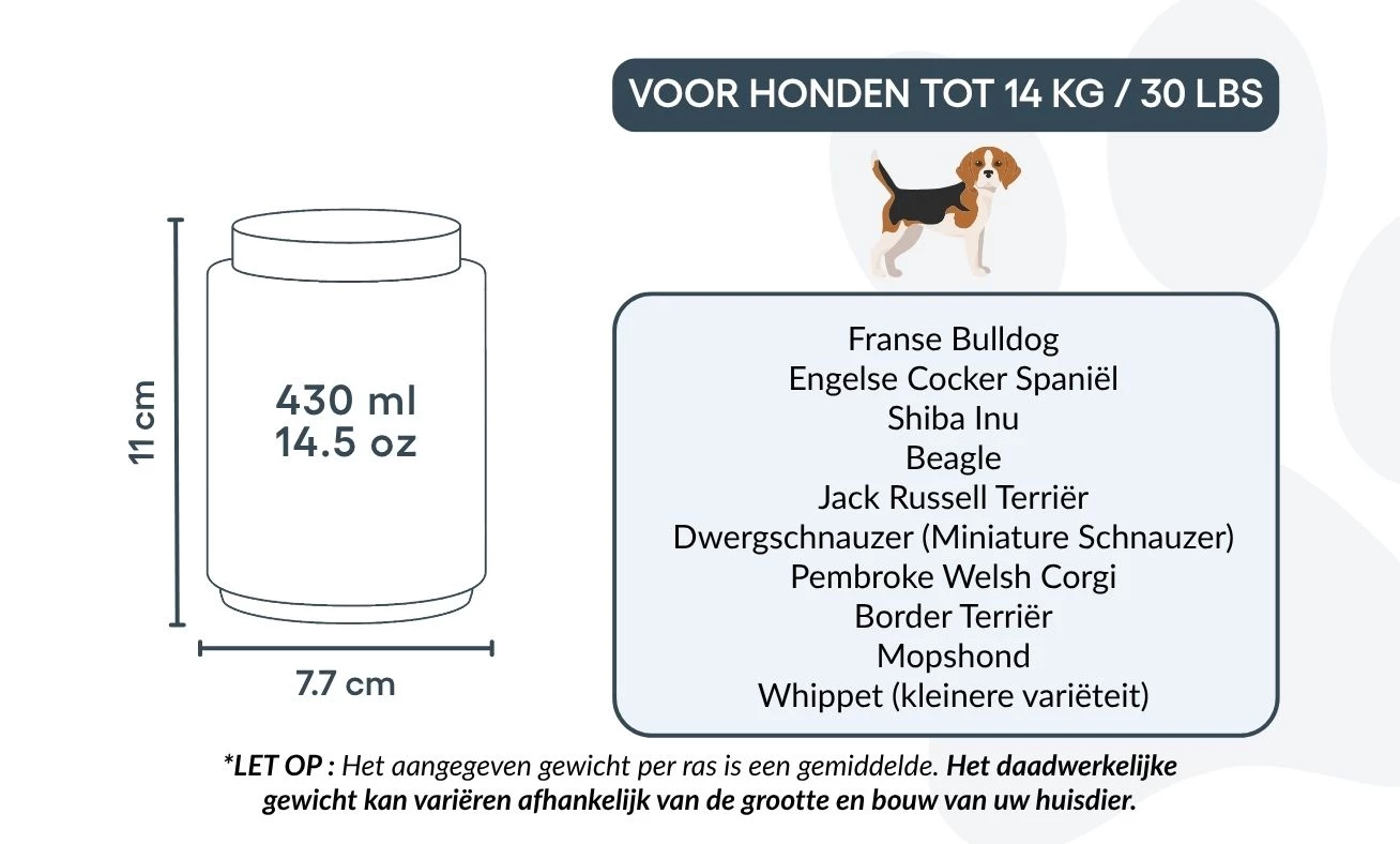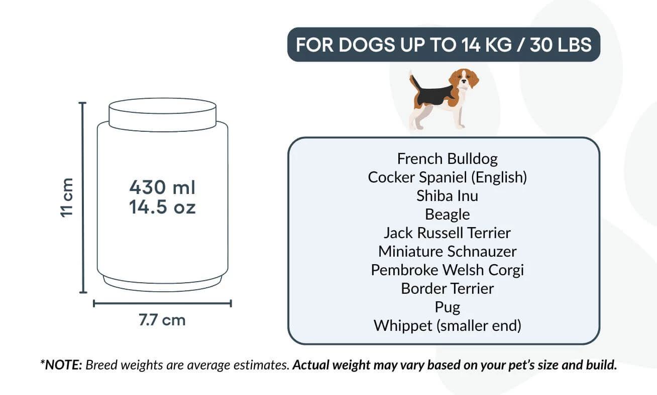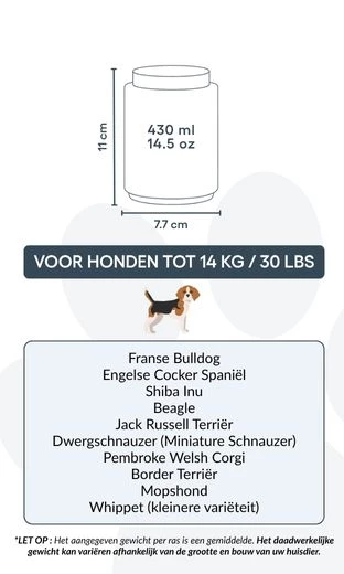 Tailles / Capacité de l’urne : Petite : 7,7 cm (L) × 11 cm (H) × 7,7 cm (P) | 430 ml / 14,5 oz Convient pour les chiens jusqu’à 14 kg / 30 lbs Races courantes : Cavalier King Charles Spaniel, Bouledogue Français, Shih Tzu, Border Terrier, Boston Terrier, Jack Russell Terrier